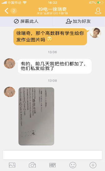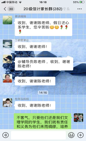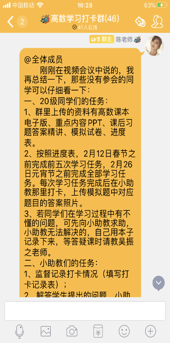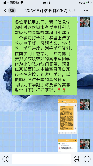 信计学院的做法得到了同学们和家长的高度赞扬和支持,它解决了同学们想在家复习却苦于没有资料和无人辅导的两大难题。短短数天,部分学生已相继完成了相关学习任务并进行了打卡,颇有成效。在安排小助教进行督促和辅导的同时,辅导员也积极与家长联系,形成家校联动促学习的合力,帮助学生攻克高数难关。