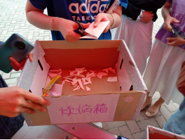 本次活动有两大主题:烦恼”一剪梅”和快乐“万花筒”。烦恼“一剪梅”玩法是:工作人员给同学发一张长方形的贺卡,参与者在此贺卡上写下自己的烦恼,然后将贺卡封入信封内并做上标记放入烦恼箱,