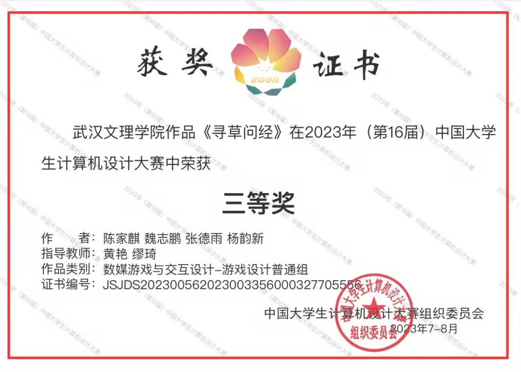 近日,2023(第16届)中国大学生计算机设计大赛全国总决赛圆满结束,由yl7703永利黄艳、缪琦老师指导,陈家麒、魏志鹏、张德雨、杨韵新等同学所创作的参赛作品《寻草问经》获得全国总决赛三等奖。